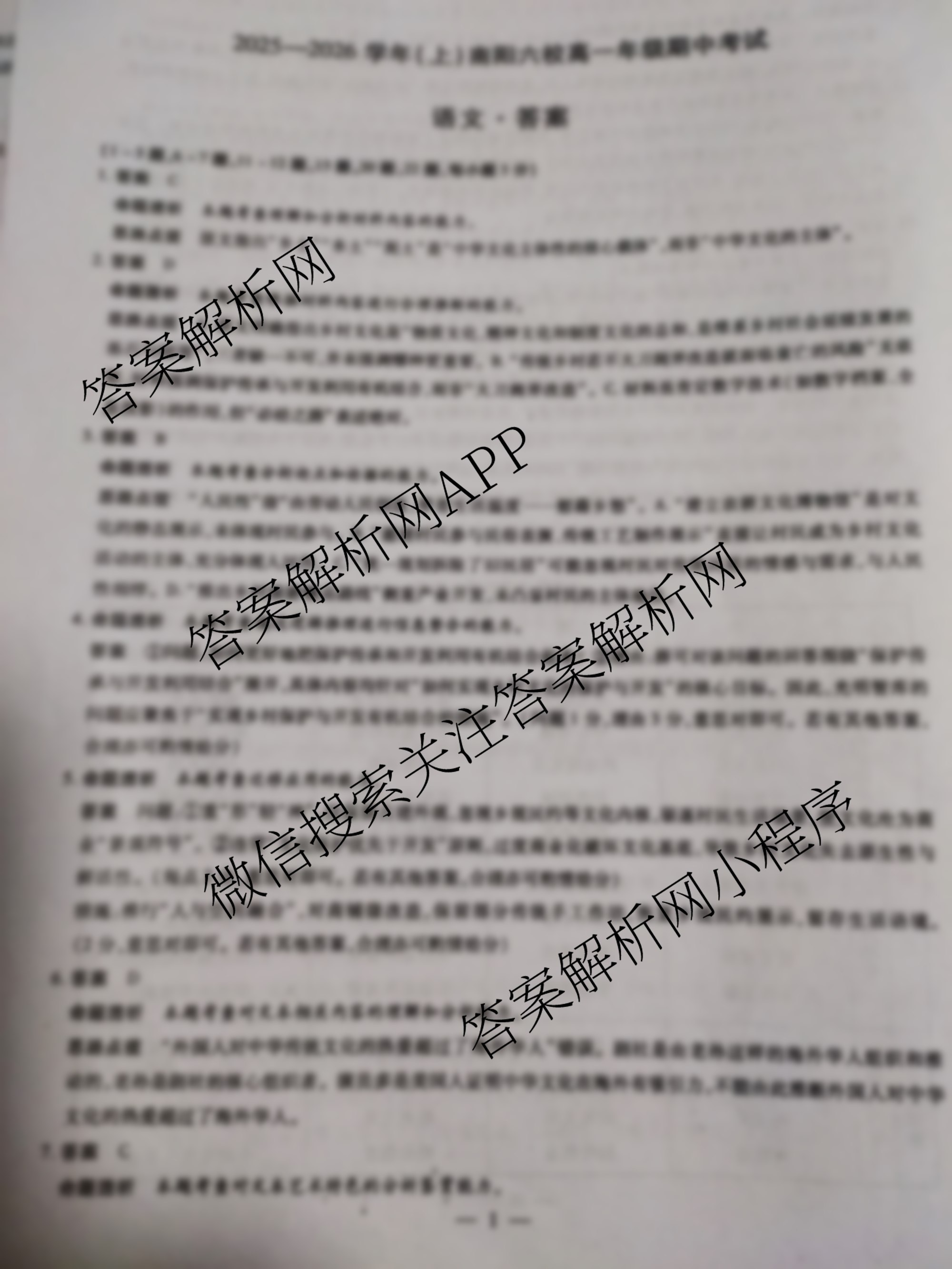 - 2025~2026(天一大联考)学年(上)南阳六校[高一]年级期中考试语文答案