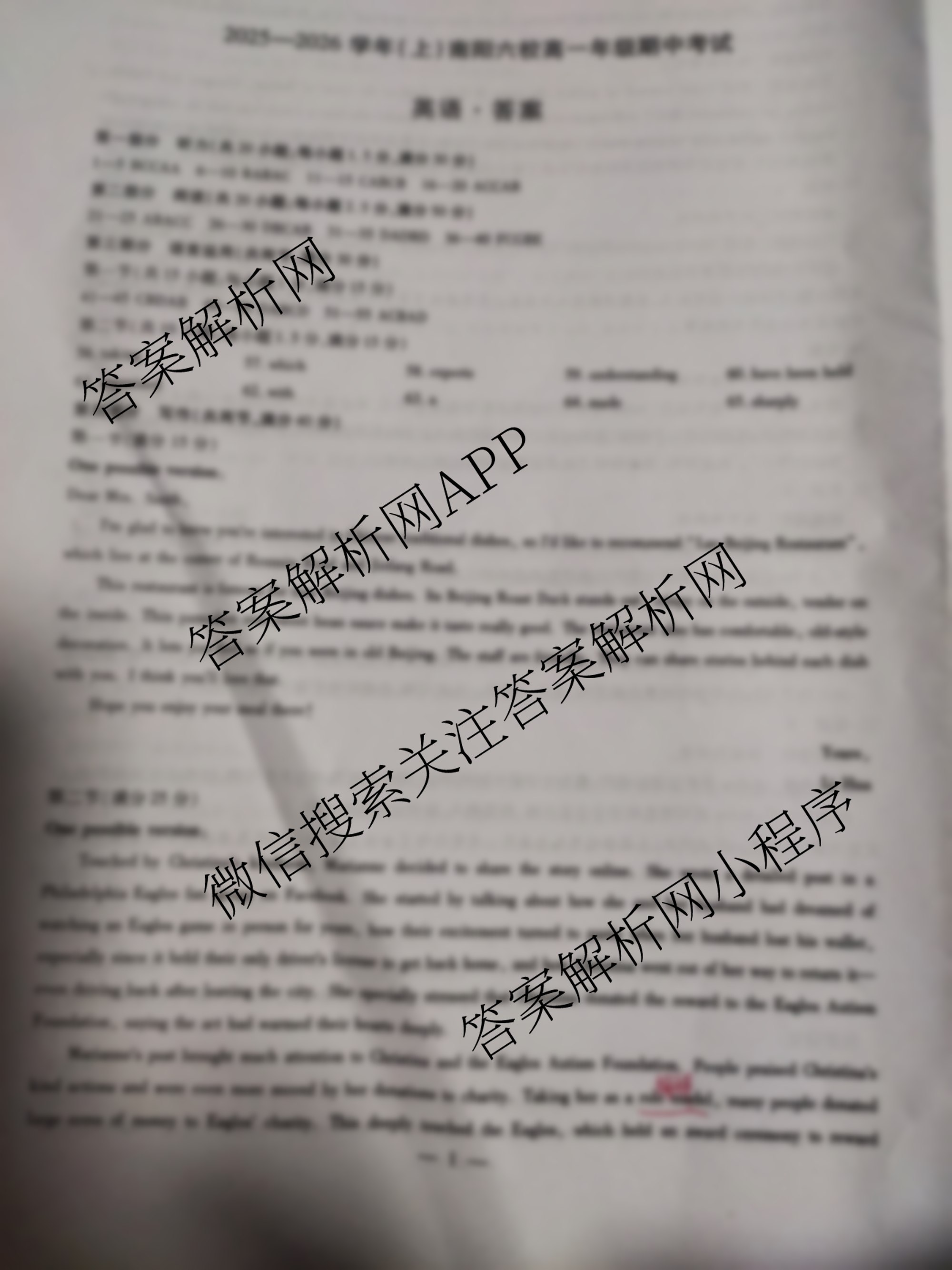 - (天一大联考)2025-2026学年(上)南阳六校[高一]年级期中考试英语答案